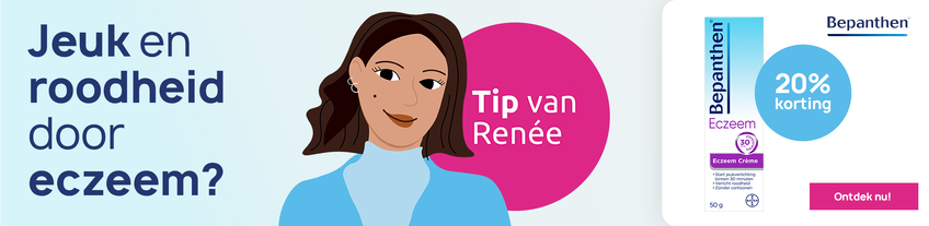 Renée:"Eczeem is een ontsteking van de bovenste huidlagen. Dit kan getriggerd worden door de winterperiode. Mijn tip: Bepanthen Eczeem crème. Krabben aan eczeem kan de ontsteking verergeren. Deze crème verlicht de jeuk (binnen 30 minuten) en roodheid effectief & helpt het huidherstel dankzij dexpanthenol (Provitamine B5). De crème smeert makkelijk uit en trekt snel in."